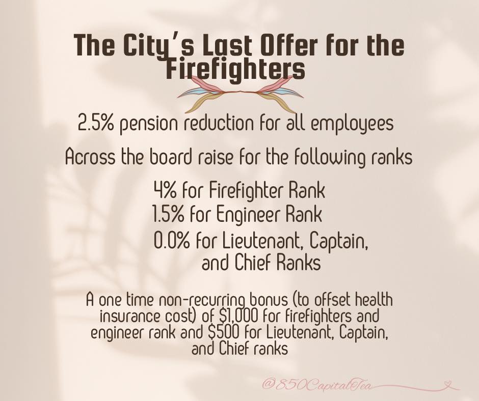 The conversation continued, comparing other departments pension contributions. Tallahassee firefighters pay the second most amount into their pensions in the state of Florida. Pension contributions are paid by both the employer and the employee. When the Union says “a decrease in pension contributions” they are saying they would pay less into their pensions and the city would pay more. This adjustment does not affect the yearly salary that an employee makes but instead allows the employee to take home more of their salary.